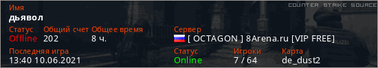 Играет на Counter Strike Source сервере. Страна: РоссияПервый раз замечен 17:56 17.01.2020