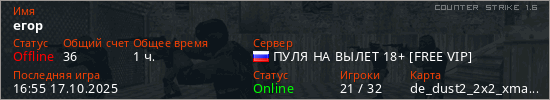 Играет на Counter Strike 1.6 сервере. Страна: РоссияПервый раз замечен 19:26 29.08.2025