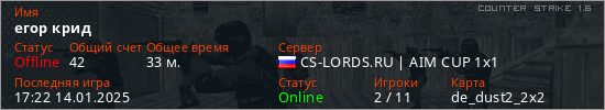 Играет на Counter Strike 1.6 сервере. Страна: РоссияПервый раз замечен 17:36 07.01.2025