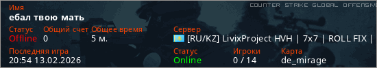 Играет на Counter Strike Global Offensive сервере. Страна: КазахстанПервый раз замечен 20:44 13.02.2026