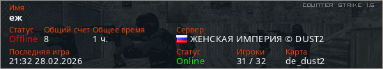 Играет на Counter Strike 1.6 сервере. Страна: РоссияПервый раз замечен 23:47 25.02.2026