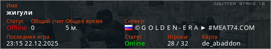 Играет на Counter Strike 1.6 сервере. Страна: РоссияПервый раз замечен 23:09 22.12.2025