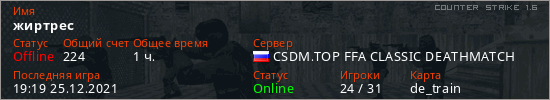 Играет на Counter Strike 1.6 сервере. Страна: РоссияПервый раз замечен 21:12 17.12.2021