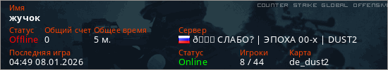 Играет на Counter Strike Global Offensive сервере. Страна: РоссияПервый раз замечен 04:45 08.01.2026