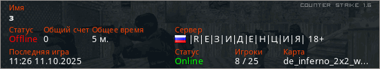 Играет на Counter Strike 1.6 сервере. Страна: РоссияПервый раз замечен 11:16 11.10.2025