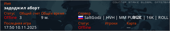 Играет на Counter Strike Global Offensive сервере. Страна: РоссияПервый раз замечен 15:07 09.11.2025