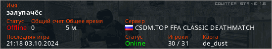 Играет на Counter Strike 1.6 сервере. Страна: РоссияПервый раз замечен 21:10 03.10.2024