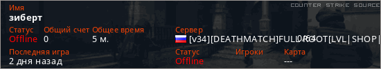 Играет на Counter Strike Source сервере. Страна: РоссияПервый раз замечен 15:29 24.12.2025