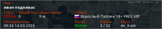 Играет на Counter Strike 1.6 сервере. Страна: РоссияПервый раз замечен 09:15 14.03.2026