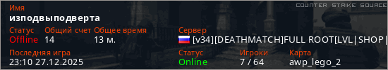 Играет на Counter Strike Source сервере. Страна: РоссияПервый раз замечен 20:36 13.12.2025