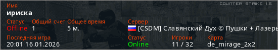 Играет на Counter Strike 1.6 сервере. Страна: РоссияПервый раз замечен 19:59 16.01.2026