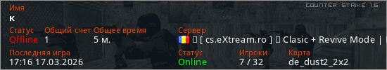 Играет на Counter Strike 1.6 сервере. Страна: РумынияПервый раз замечен 17:12 17.03.2026
