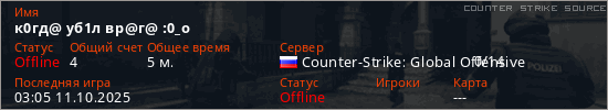 Играет на Counter Strike Source сервере. Страна: РоссияПервый раз замечен 02:03 11.10.2025