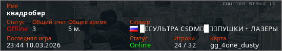 Играет на Counter Strike 1.6 сервере. Страна: РоссияПервый раз замечен 23:35 10.03.2026