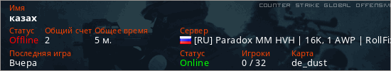 Играет на Counter Strike Global Offensive сервере. Страна: РоссияПервый раз замечен 22:19 30.01.2026
