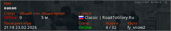 Играет на Counter Strike 1.6 сервере. Страна: РоссияПервый раз замечен 21:16 23.02.2026