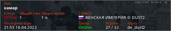 Последний раз был в сети 21:55 16.04.2023 Игрок с таким ником замечен на 8 серверах
