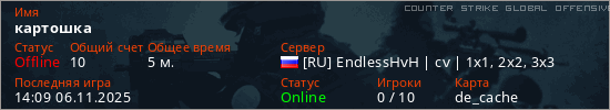 Играет на Counter Strike Global Offensive сервере. Страна: РоссияПервый раз замечен 13:44 06.11.2025