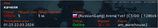 Играет на Counter Strike Global Offensive сервере. Страна: РоссияПервый раз замечен 01:15 22.03.2026