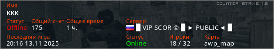 Играет на Counter Strike 1.6 сервере. Страна: РоссияПервый раз замечен 19:58 08.11.2025