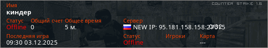 Играет на Counter Strike 1.6 сервере. Страна: РоссияПервый раз замечен 09:05 03.12.2025