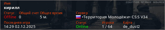 Играет на Counter Strike Source сервере. Страна: РоссияПервый раз замечен 14:27 02.12.2025