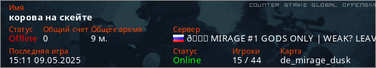 Играет на Counter Strike Global Offensive сервере. Страна: РоссияПервый раз замечен 13:08 09.05.2025