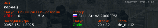 Играет на Counter Strike 1.6 сервере. Страна: РоссияПервый раз замечен 00:42 15.11.2025