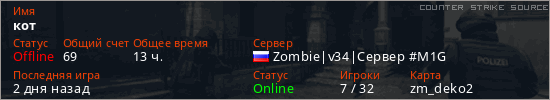 Играет на Counter Strike Source сервере. Страна: РоссияПервый раз замечен 04:01 30.06.2025