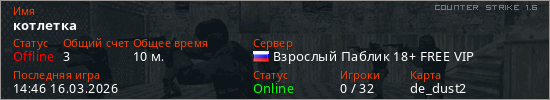 Играет на Counter Strike 1.6 сервере. Страна: РоссияПервый раз замечен 17:32 11.03.2026