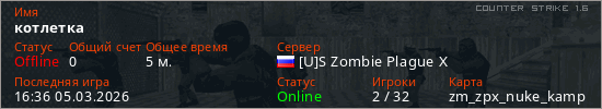 Играет на Counter Strike 1.6 сервере. Страна: РоссияПервый раз замечен 16:32 05.03.2026