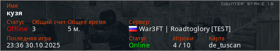 Играет на Counter Strike 1.6 сервере. Страна: РоссияПервый раз замечен 23:34 30.10.2025