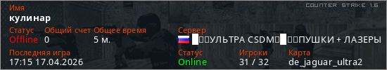 Играет на Counter Strike 1.6 сервере. Страна: РоссияПервый раз замечен 16:58 17.04.2026