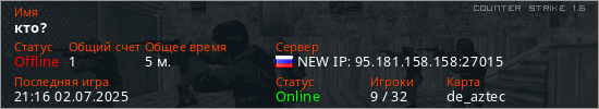 Играет на Counter Strike 1.6 сервере. Страна: РоссияПервый раз замечен 21:08 02.07.2025