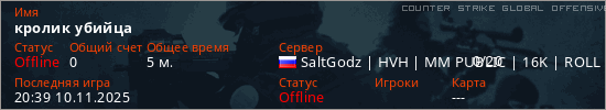 Играет на Counter Strike Global Offensive сервере. Страна: РоссияПервый раз замечен 20:35 10.11.2025