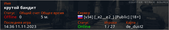 Играет на Counter Strike Source сервере. Страна: РоссияПервый раз замечен 14:32 11.11.2023