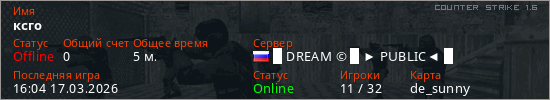 Играет на Counter Strike 1.6 сервере. Страна: РоссияПервый раз замечен 15:58 17.03.2026