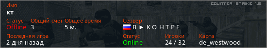 Играет на Counter Strike 1.6 сервере. Страна: РоссияПервый раз замечен 18:00 11.04.2026