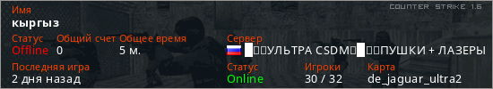 Играет на Counter Strike 1.6 сервере. Страна: РоссияПервый раз замечен 16:10 19.04.2026
