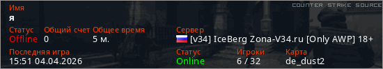 Играет на Counter Strike Source сервере. Страна: РоссияПервый раз замечен 15:49 04.04.2026