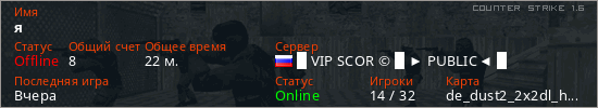 Играет на Counter Strike 1.6 сервере. Страна: РоссияПервый раз замечен 14:25 21.02.2026