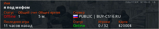 Играет на Counter Strike 1.6 сервере. Страна: РоссияПервый раз замечен 22:28 29.03.2026