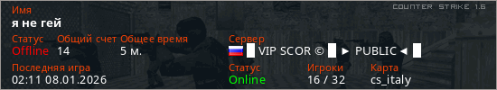 Играет на Counter Strike 1.6 сервере. Страна: РоссияПервый раз замечен 02:09 08.01.2026
