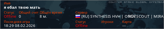 Играет на Counter Strike Global Offensive сервере. Страна: РоссияПервый раз замечен 18:11 08.02.2026
