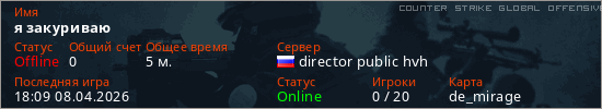 Играет на Counter Strike Global Offensive сервере. Страна: РоссияПервый раз замечен 16:44 08.04.2026