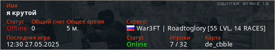 Играет на Counter Strike 1.6 сервере. Страна: РоссияПервый раз замечен 12:28 27.05.2025