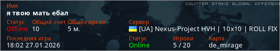 Играет на Counter Strike Global Offensive сервере. Страна: УкраинаПервый раз замечен 17:55 27.01.2026
