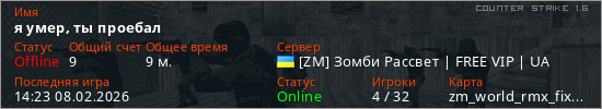 Играет на Counter Strike 1.6 сервере. Страна: УкраинаПервый раз замечен 22:07 06.02.2026