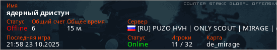 Играет на Counter Strike Global Offensive сервере. Страна: РоссияПервый раз замечен 22:40 06.10.2025