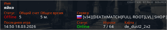 Играет на Counter Strike Source сервере. Страна: РоссияПервый раз замечен 14:23 18.03.2026